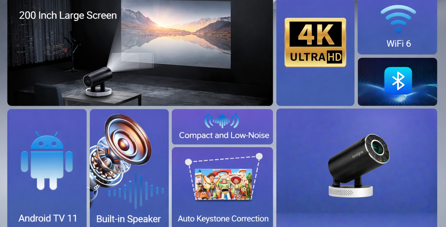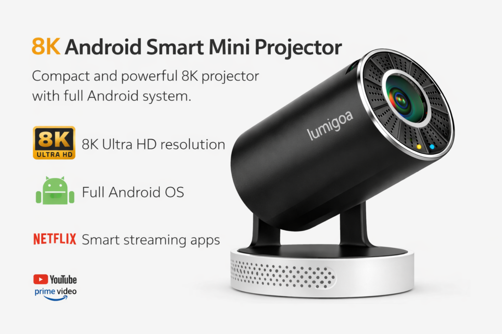 Designed with a sleek, compact body, the Lumigoa 8K Android Mini Projector delivers professional-grade visuals wherever you go. Despite its small size, it supports native 8K Ultra HD decoding, ensuring every frame is rich in detail, color, and clarity — perfect for entertainment or business use.