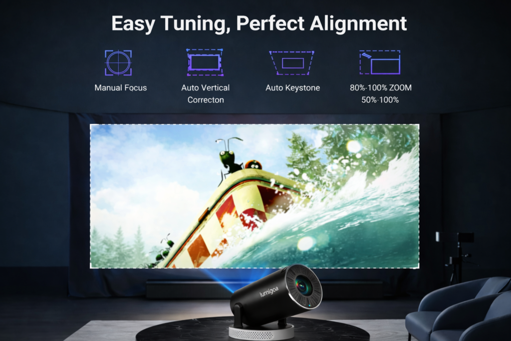 Our projector is designed with flexible alignment features to fit any environment. With manual focus, auto vertical correction, and 4-point keystone adjustment, setup is quick and precise — no matter the angle or surface.