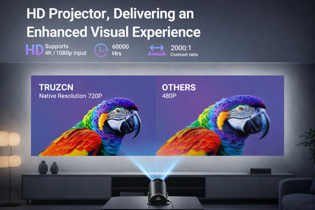 Enjoy crisp, vibrant visuals with native 720P resolution and support for 4K/1080P input. With a high contrast ratio of 20000:1, every scene is rich in detail — from bright highlights to deep shadows.