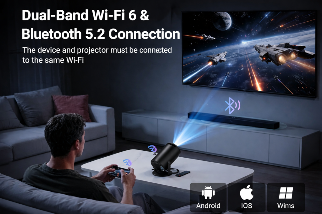 Fully compatible with Android, iOS, and Windows devices, it allows easy screen mirroring and media playback. Simply connect your device and the projector to the same Wi-Fi network — no cables needed, just instant, immersive projection.