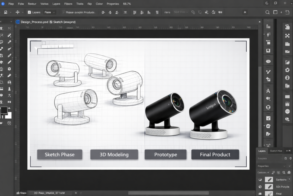 Our projector goes through a meticulous design journey, starting from hand-drawn sketches to detailed 3D modeling, then refined into functional prototypes before becoming the final product. Every stage is driven by user needs, aesthetics, and performance optimization.