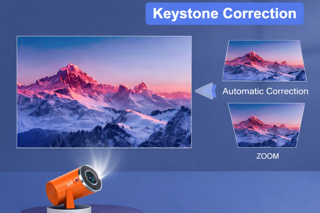 The built-in keystone correction feature automatically adjusts the image to ensure a square and aligned projection, even when the projector is placed at an angle. This means you always get a perfect screen shape without manual tweaking.